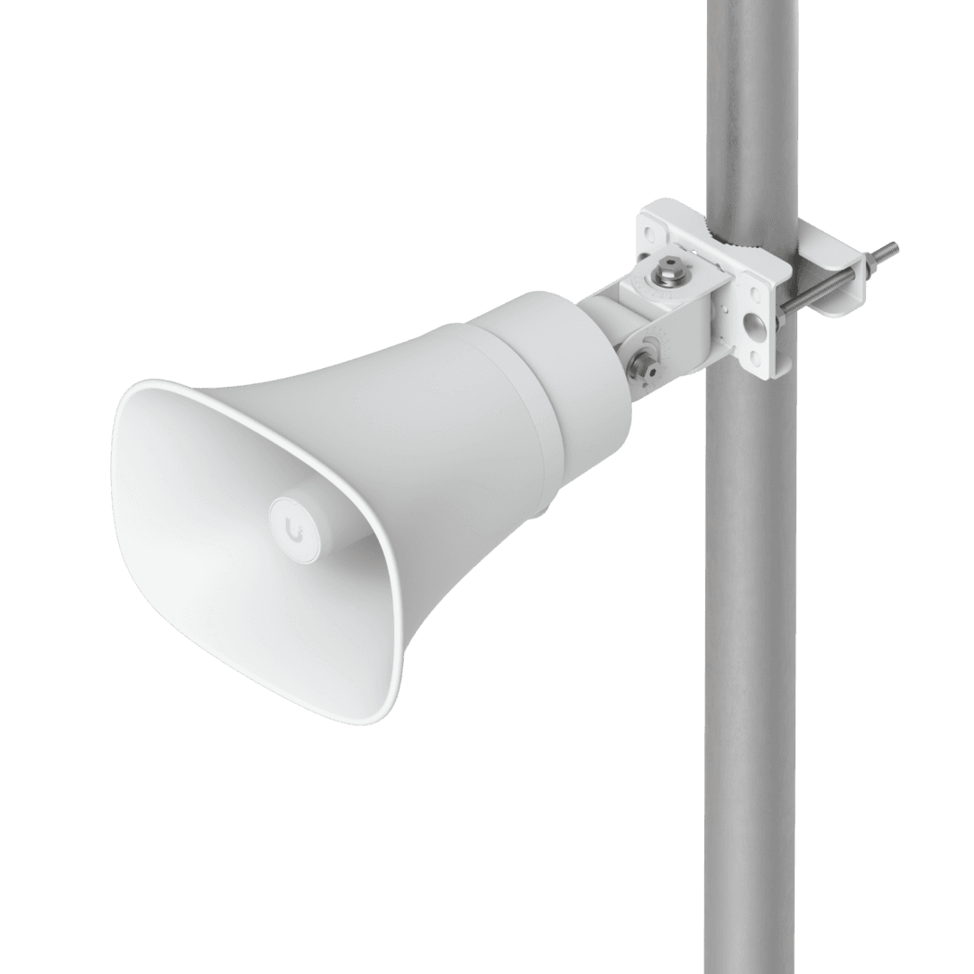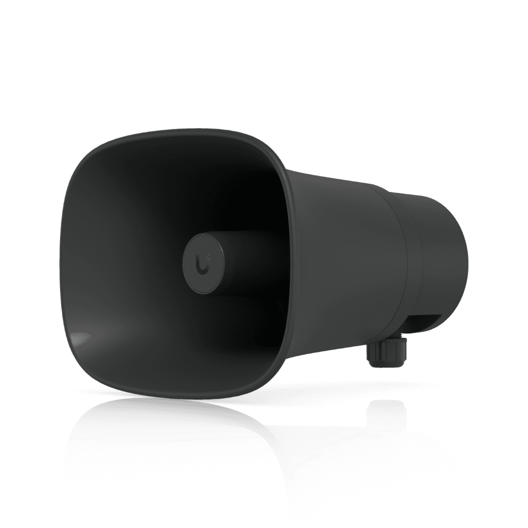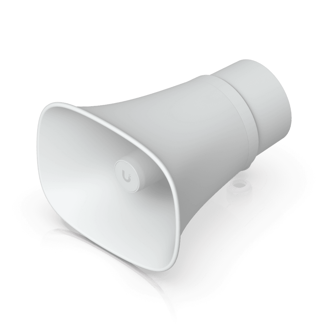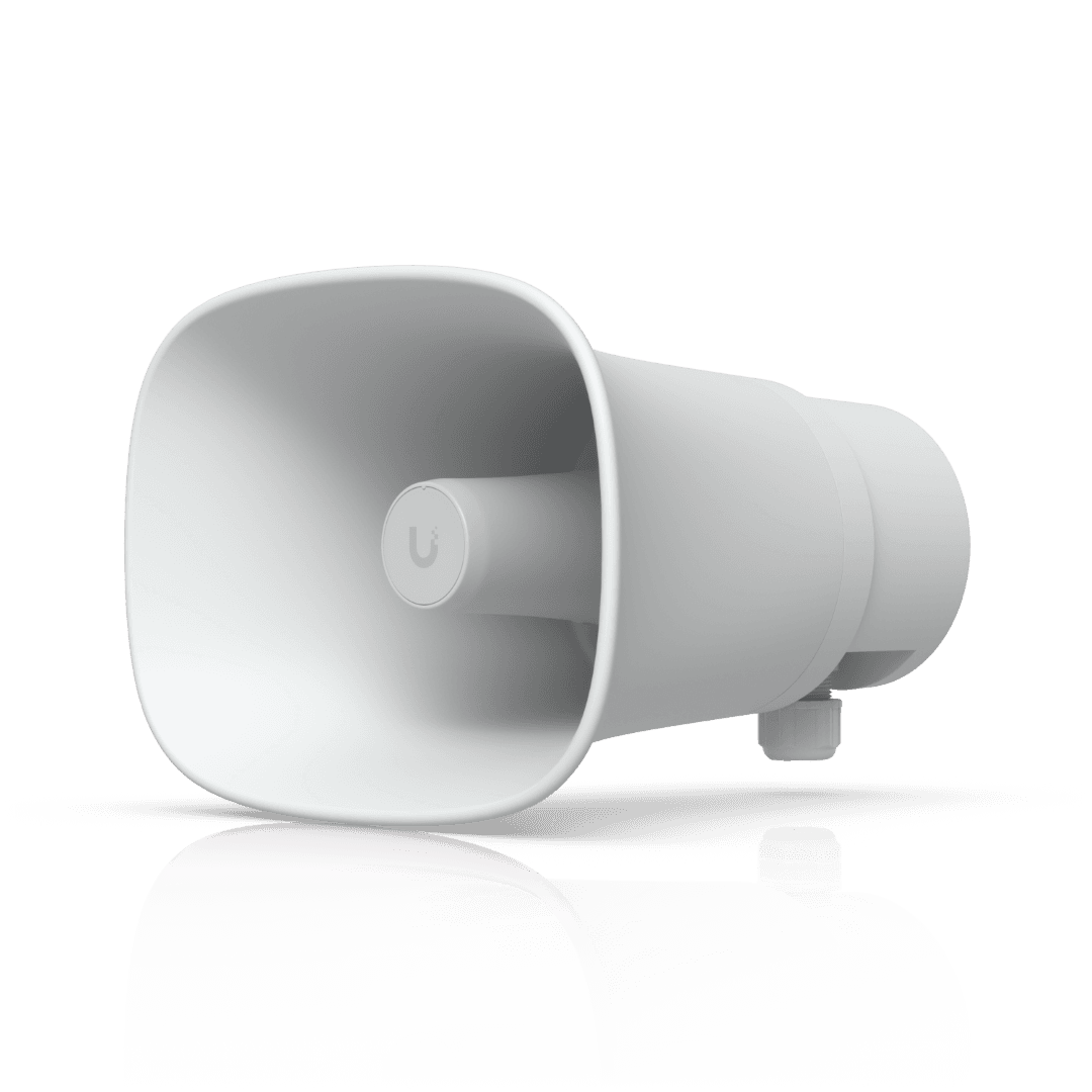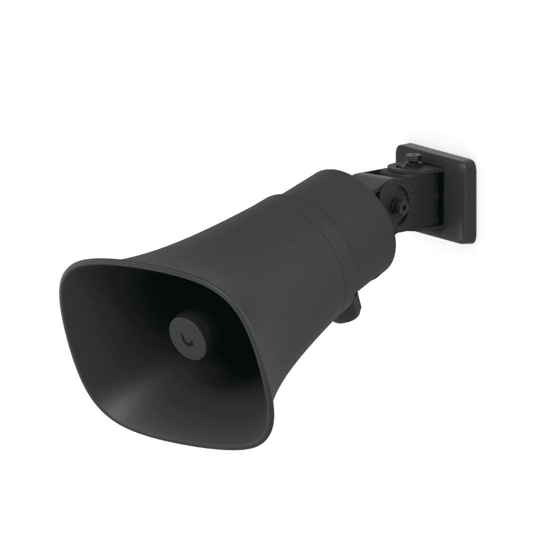 The AI Horn Speaker is a powerful, weather-resistant outdoor audio solution designed for real-time announcements, security warnings, and automated voice alerts in business, industrial, and enterprise environments. Ideal for parking areas, campuses, warehouses, and perimeters, it delivers loud, clear audio to help deter intruders, guide visitors, or broadcast safety messages—without the need for separate power sources thanks to PoE+ support. Its rugged IP66-rated enclosure withstands harsh outdoor conditions, while the included articulating mount allows flexible wall or pole installation for precise coverage. Fully managed through UniFi Protect on web and mobile, the AI Horn Speaker enables centralized control, scheduled announcements, and smart event-based alerts, making it a reliable and professional solution for modern security and public address needs.
