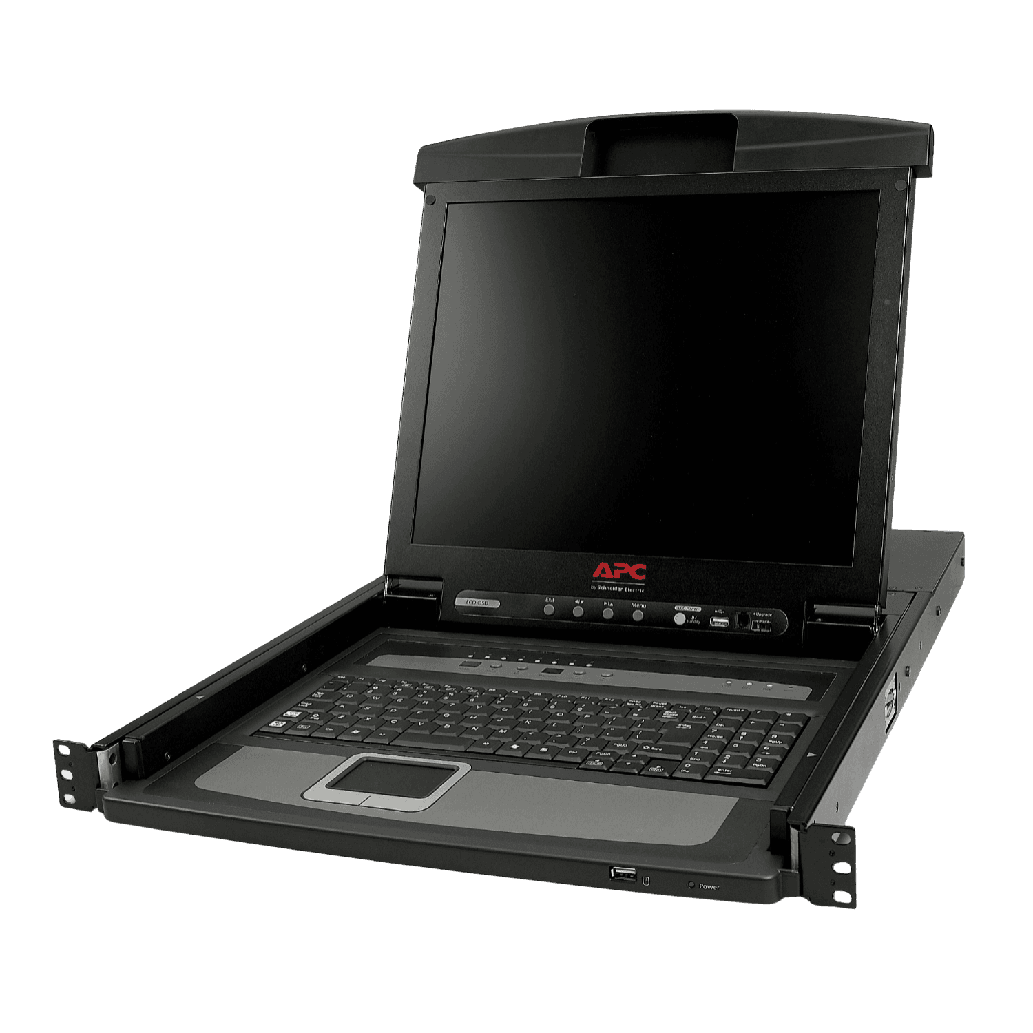 APC AP5808 17" Rack LCD Console with Integrated 8-Port Analog KVM Switch | 17" (43.2cm) LCD Display 337.9x270.3mm Active Area | 16-Color Display | Integrated Full Keyboard and Touchpad | 8 System Connections + 1 Chain Out Port | 1U Rack Height (1.7" x 19" x 28") 14kg Weight | Minimum Depth 680mm Maximum Depth 1050mm | VGA Display Connection | PS/2 and USB Interface Support | Cascade up to 31 KVM Switches | 120/240V 50/60Hz IEC-320-C14 Power Input | Operating Temperature 0-40°C | Quick Release Tabs and Slide Rails | On-Screen Display (OSD) Controls | Cable Management Arm | Auto Power Down when Closed | Windows Sun Unix Linux Compatible | C13-C14 Power Cord NEMA 5-15 Power Cord PS2/USB KVM Cables Single User Rack Mount Kit Documentation CD Firmware Upgrade Cable Installation Guide Included