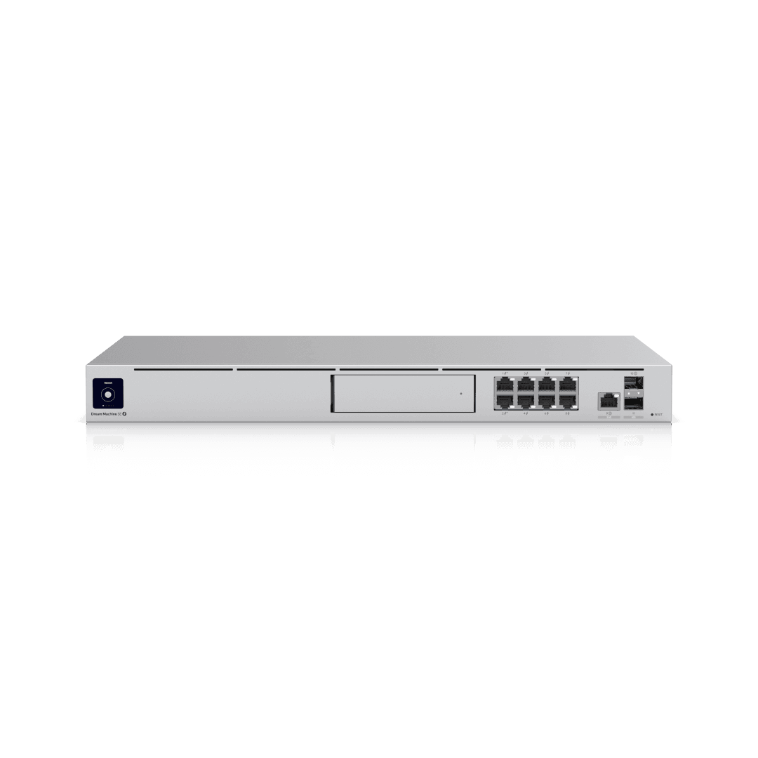 Consolidate comprehensive routing, switching, and UniFi application management with the Ubiquiti Dream Machine series, ranging from the desktop-optimized UDM featuring integrated WiFi 5 (up to 1.7 Gbps) and a 1.7 GHz quad-core processor with 2GB RAM, to the advanced 1U rack-mountable enterprise gateways: the UDM-Pro delivering 3.5 Gbps IDS/IPS throughput, an 8-port GbE switch, dual 10G SFP+ ports, and a single 3.5-inch NVR HDD bay; the UDM-SE upgrading the platform with a 180W PoE/PoE+ switch, a 2.5 GbE WAN interface, and an integrated 128GB SSD; and the high-capacity UDM-Pro-Max scaling to 5 Gbps IDS/IPS, dual 3.5-inch NVR bays, an upgraded 2.0 GHz processor, and 8GB RAM to seamlessly support over 200 UniFi devices and 2,000 simultaneous users with Shadow Mode (VRRP) High Availability, OSPF/BGP dynamic routing, and advanced Layer 7 security. 1-Year Limited Warranty.