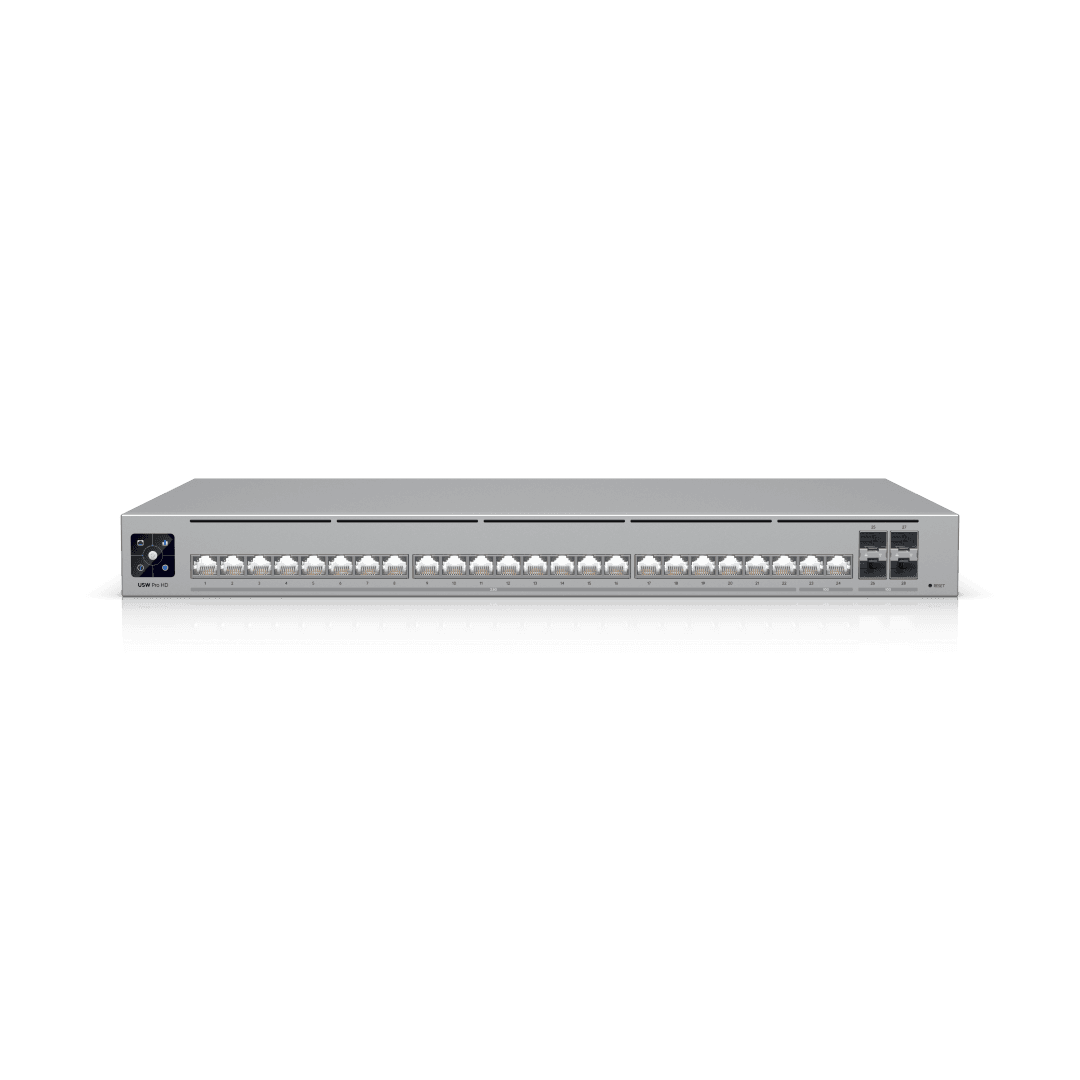 Pro HD 24 is a high-performance 1U rackmount managed network switch designed for modern business, office, and enterprise environments that need fast, reliable, and scalable connectivity. Built to handle high-density devices, servers, access points, and professional AV systems, it delivers smooth performance for bandwidth-intensive tasks like video conferencing, content creation, IP surveillance, and Pro AV deployments. Advanced Layer 3 capabilities and intelligent traffic management help keep networks efficient and secure as they grow, while built-in power redundancy ensures dependable uptime. Managed through the intuitive UniFi Network platform and enhanced with Etherlighting™ for easy port identification, Pro HD 24 simplifies deployment and day-to-day network management for professional IT environments. 1-Year Limited Warranty.