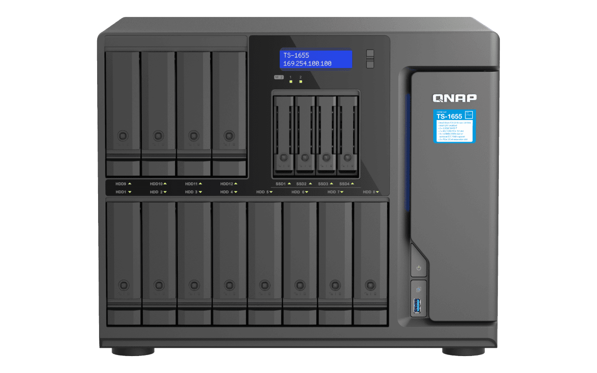 The QNAP TS-1655 is a high-capacity, 16-bay hybrid storage solution designed to provide massive data density and robust performance in a versatile desktop form factor. Powered by an 8-core Intel® Atom® C5000 series processor and the feature-rich QTS (or ZFS-based QuTS hero) operating system, this powerhouse features twelve 3.5-inch SATA bays for high-capacity HDDs and four 2.5-inch SATA bays for high-speed SSD tiering. Equipped with dual 2.5GbE ports and dual M.2 PCIe Gen 3 slots for NVMe SSD caching, it is optimized for virtualization, large-scale backup, and intensive file-sharing workflows. With support for up to 128 GB of DDR4 ECC memory and expandability via PCIe Gen 3 slots for 10GbE/25GbE networking, the TS-1655 ensures maximum storage efficiency and mission-critical data integrity for growing business IT environments.