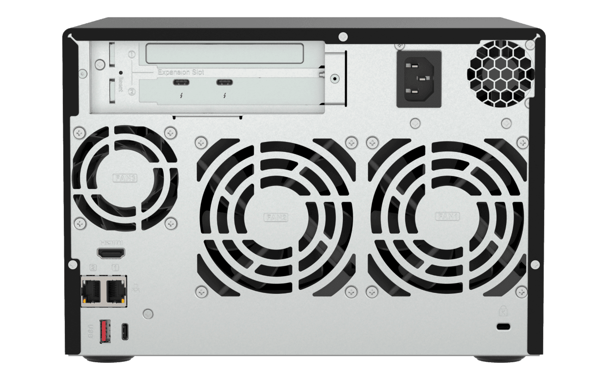 The QNAP TVS-h674T is a high-speed, 6-bay Thunderbolt™ 4 NAS engineered to meet the extreme performance demands of creative professionals and collaborative media studios. Driven by powerful 12th Gen Intel® Core™ multi-core processors and the ZFS-based QuTS hero operating system, this powerhouse features dual Thunderbolt™ 4 ports and dual 2.5GbE connectivity for seamless 4K video editing and massive file transfers. Equipped with dual M.2 PCIe Gen 4 slots for NVMe SSD caching and expandable via PCIe Gen 4 slots for 10GbE/25GbE networking, it is optimized for virtualization, real-time transcoding, and intensive multi-user workflows. With advanced data reduction technologies like inline deduplication and compression, alongside an HDMI 1.4b output for direct 4K monitoring, the TVS-h674T ensures maximum storage efficiency and mission-critical data integrity for high-end business productivity.